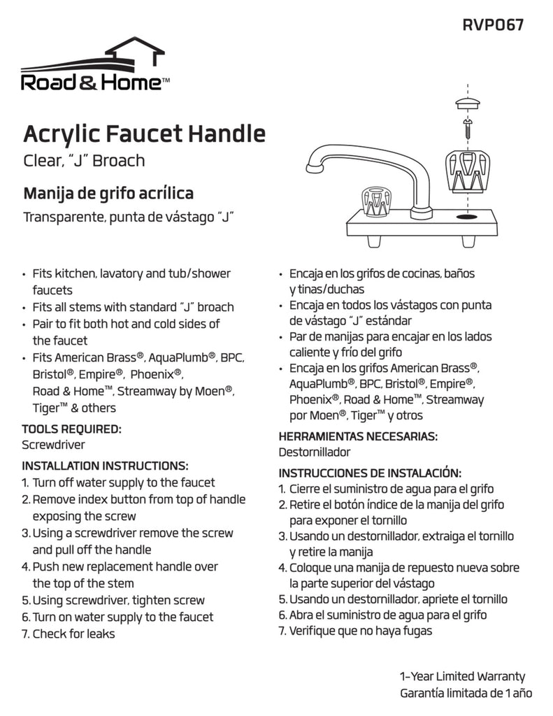 Faucets are one of the first things you see when you wake up in the morning and the last things you see before you go to sleep. Your faucet handles should complement the quality of the other features of your bathroom, so keep them updated by installing the Road & Home Acrylic Faucet Handles, attractive and practical replacements. The clear handle set provides extensive durability and corrosion resistance while retaining an elegant appearance that goes with almost any interior design. All the hardware you need to update RV and mobile home faucets is included in this package, and the standard fit is designed to provide easy installation. These handles are the clear choice for any bathroom update.