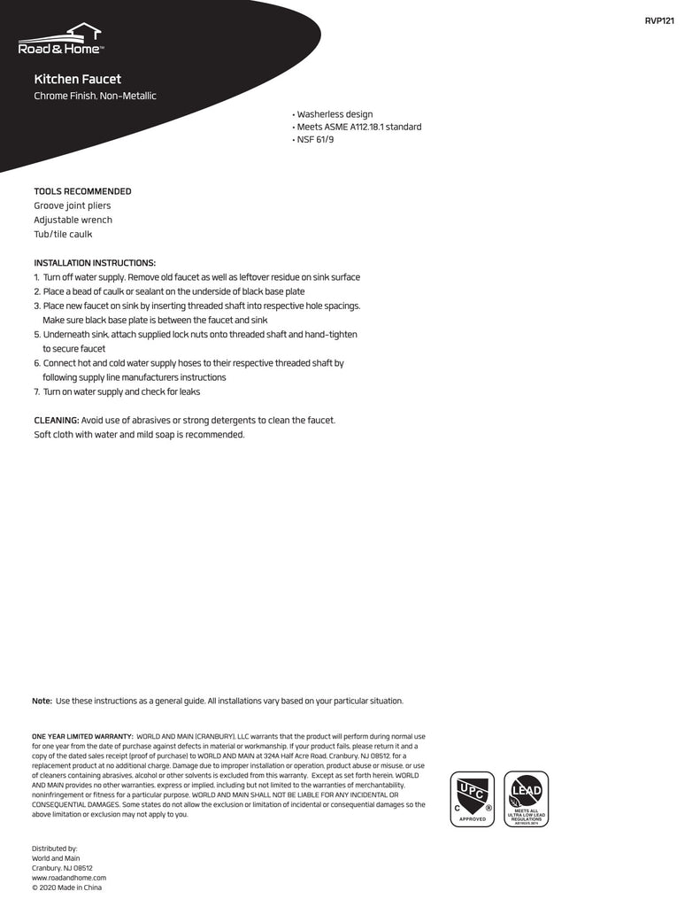 The built-in kitchen is a big draw for mobile home and recreational vehicle owners, especially considering the value of clean, running water when you are constantly on-the-go. When one feature of the kitchen does not work, making repairs is a top priority. The Road & Home non-metallic two-handle Kitchen Faucet is a winning combination of value and traditional design. It features a highly functional construction that is easy to install and maintain. The durable plastic construction of this product features an attractive chrome finish and clear acrylic handles that enhance your existing decor. The 8 in. swivel spout adds an additional touch of convenience. When you need to make repairs or replace the faucet in your RV or mobile home, this model is both attractive and convenient.