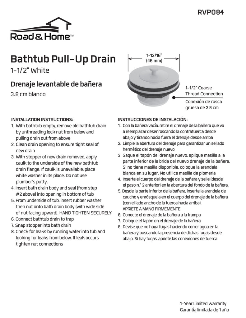 Long camping trips or cross-country treks in an RV and mobile home can mean close quarters living for several days or even weeks. Staying clean is essential to keeping everyone as comfortable as possible during those long drives. Potable water is at a premium, especially if you are boondocking. Don't let a leaking drain ruin your trip. A firm pop-stop drain that prevents leakage is essential to conserving as much water as possible, while still getting clean. It is also a vital part of the plumbing system. The Road & Home Bathtub Pull-Up Drain also helps eliminate clogs and prevents unwanted debris from draining into the gray water tank. Made of durable non-metal materials to reduce degradation.