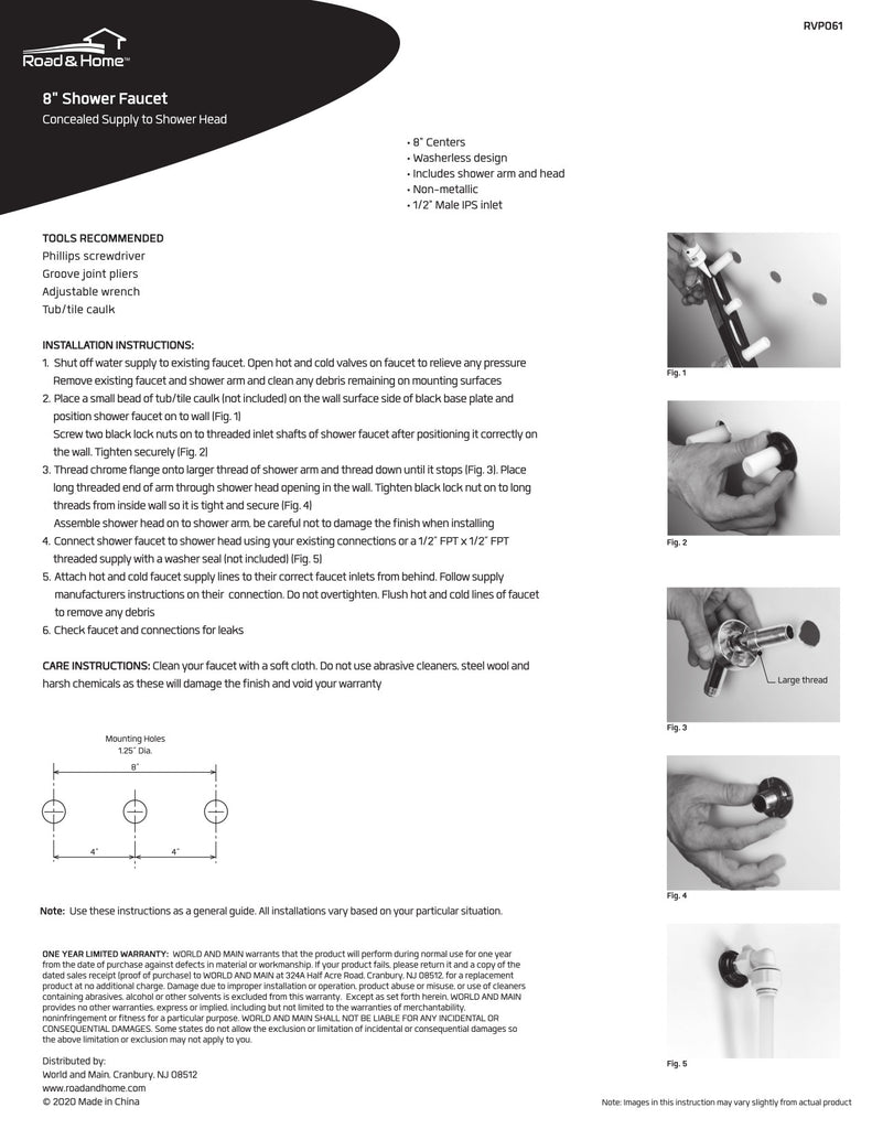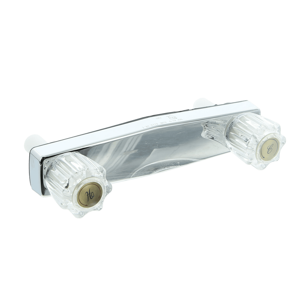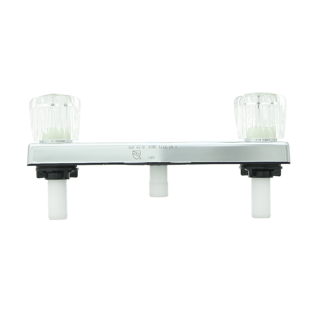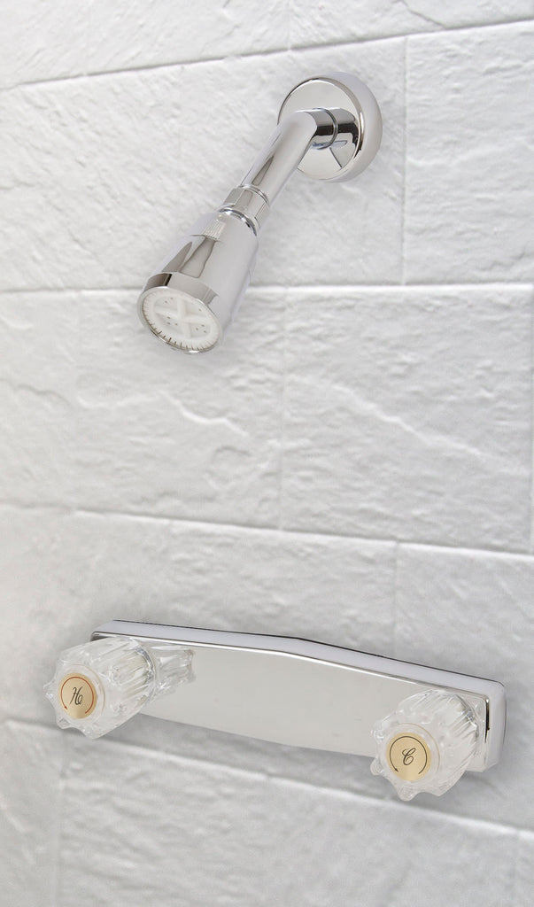 The Road and Home 8" Shower Faucet has a universal fit designed to integrate with many different RV showers. With its included shower arm, flange and showerhead, the faucet works for both shower repairs and system upgrades. Featuring durable construction, the faucet also resists leaks and drips, helping to keep the areas behind and around the shower dry. The showerhead maintains consistent flow and pressure, allowing you to conserve valuable water while fully enjoying your shower experiences. Installation is a breeze using only a few basic tools that you likely already have. This particular model connects a water supply, which is in line horizontally with the valves, ensuring that your shower supply and water source line up. Its durable non-metallic construction with an elegant chrome-plated finish will resist corrosion and elevate the look of your bath.