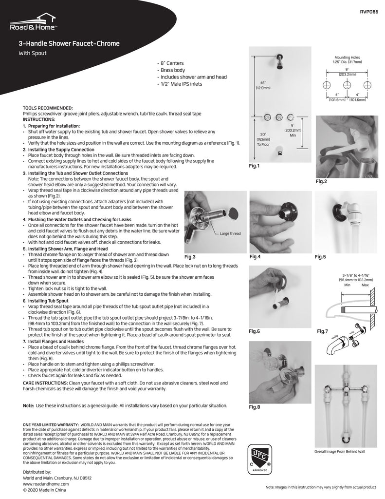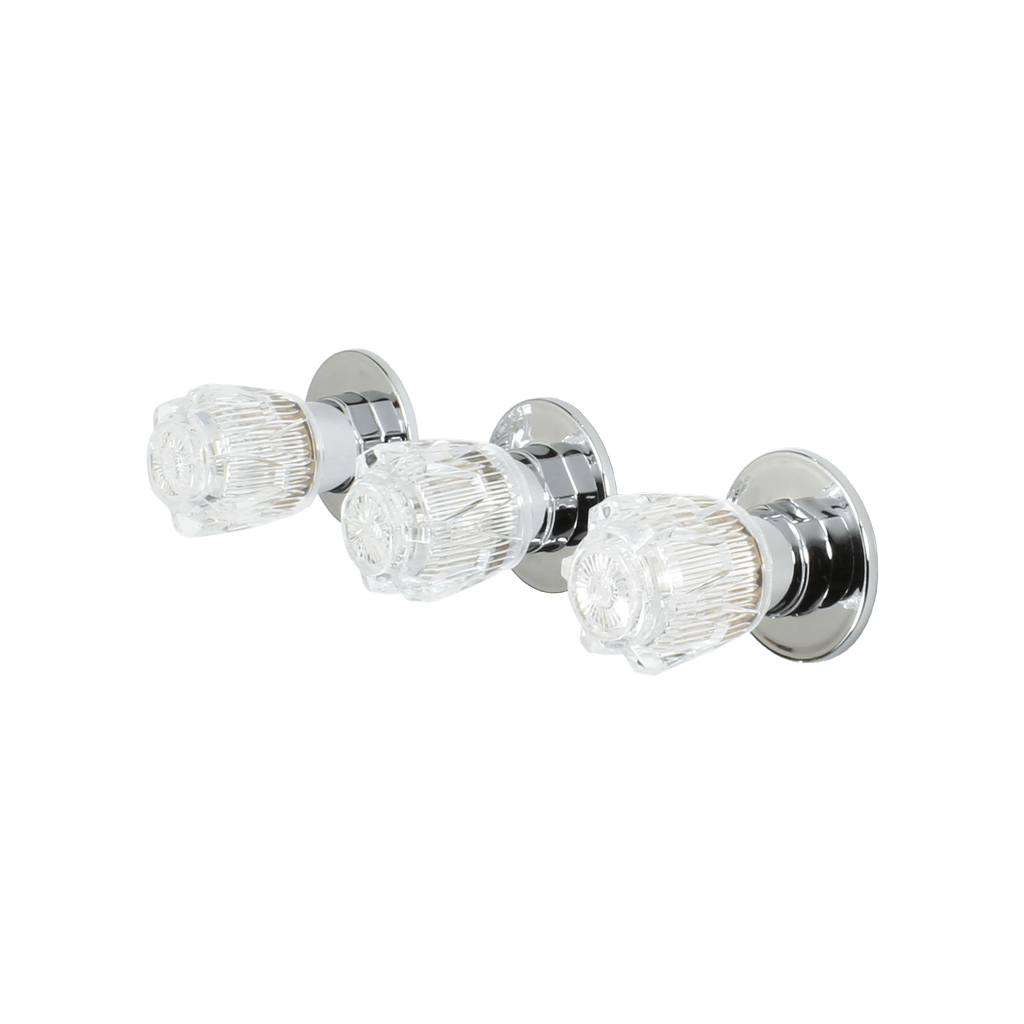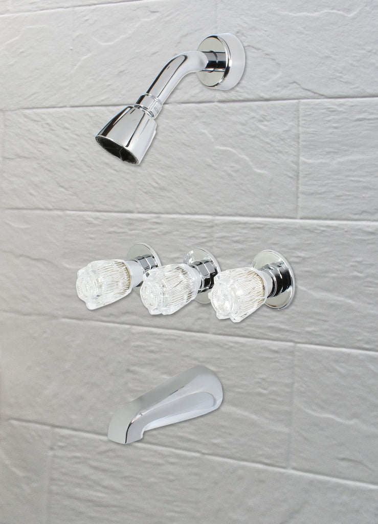Dripping faucets and difficult to move handles can waste water and make showering difficult. This RV & Mobile Home 3-Handle Faucet can replace the factory fixtures with style. The chrome finish on the spout and stems provide classic elegance to a small shower space and complements almost any decor. The clear acrylic handles make the water temperature easy to control, preventing scalding. This type of faucet enables you to control the shower and tub water supply by turning the middle handle. The brass body is strong and durable, helping to keep corrosion at bay. The washerless stems last longer than the traditional washer-style options and may remain maintenance-free for years. Includes matching tub spout, shower arm, flange, and showerhead.